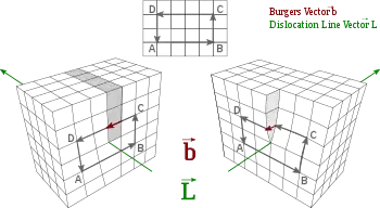 In edge dislocations, the Burgers vector and dislocation line are perpendicular to one another. In screw dislocations, they are parallel.[3]