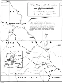 As the movement for decolonisation grew in the post-Second World War era, France gradually granted more political rights and representation for its African territories, culminating in the granting of broad internal autonomy to each colony in 1958 within the framework of the French Community.[5] In August 1960 both Niger and Upper Volta (renamed Burkina Faso in 1984) gained full independence, and their mutual frontier became an international one between two sovereign states.[3] On 23 June 1964 the two new governments met and formally agreed to settle their shared border, however it appears no final arrangement came out of these discussions[3] A full border demarcation remained incomplete until the late 1980s, however disputes about the interpretation of colonial-era boundary treaties prompted the two states to submit the dispute to the International Court of Justice in 2010.[6][7] The ICJ subsequently ruled on the dispute in 2013, recommending some small territorial exchanges, which were accepted by both governments.[8][9][10]