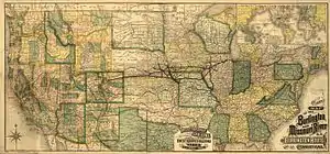 A sub-branch of the railroad was founded in Nebraska in 1869,[1] with rails first entering the state in 1870 via Plattsmouth.[3] That summer, the railroad reached Lincoln, the recently designated state capital.[1] It later continued to lay rails westward and eventually joining with the Union Pacific Railroad on September 3, 1872 at Kearney; this had the effect of linking traffic from southern Nebraska to the rest of the continent.[3] That same year it began advertising "millions of acres of cheap land" as an incentive to prospective settlers to Iowa and Nebraska.[4]