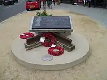 The memorial was designed by Chris Roche of 11.04 Architects,[1] following a campaign in the Camden New Journal, and features a granite slab supported by short crossed sections of wooden railway sleepers and metal rails, mounted on a white circular plinth. The slab bears an inscription, and is also inscribed with an image of an emaciated Far East prisoner of war (FEPOW) drawn by the artist Ronald Searle, who was himself forced to work on the Burma Railway.[2][3][4][5][6]