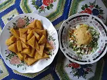 Burmese tofu (Burmese: တိုဖူး, pronounced [tòpʰú]; or Burmese: တိုဟူး, pronounced [tòhú]) is a food of Shan origin, made from water and flour ground from yellow split peas and the Burmese version of chickpea flour, also known as besan flour, in a fashion similar to polenta.[1] The flour is mixed with water, turmeric, and a little salt and heated, stirring constantly, until it reaches a creamy consistency. It is then transferred into a tray and allowed to set. It can also be made using dried chickpea instead of processed flour. In this process, dried chickpeas are soaked overnight. Once the peas have been re-hydrated, they are ground into a puree with some of the liquid used to soak the peas, then allowed to set for a couple of hours. Much of the top layer of clear liquid is then skimmed off and the remaining puree is brought to a boil with turmeric and salt and cooked and set in the same manner as the version using chickpea flour. It is matte yellow in colour, jelly-like but firm in consistency, and does not crumble when cut or sliced. It may be eaten fresh as a Burmese tofu salad or deep-fried into a Burmese fritter. It may also be sliced and dried to make crackers for deep frying. Despite the name, Burmese tofu is unrelated to Chinese tofu,[2] which is made from soy milk with added coagulants.