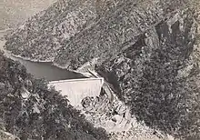 Construction commenced in 1907. Prior to about February 1911, the dam was known as Barren Jack, a corruption of the Aboriginal name of the locality.[10][11] A 2 ft (610 mm) narrow gauge railway was constructed from the New South Wales Government Railways' Main Southern Line at Goondah to bring materials to the site.[12][13] The railway was about 45 kilometres (28 mi) long, had a grade of 1 in 30 and some 90 foot-radius curves and took about 2 hours and 20 minutes to traverse.[14]