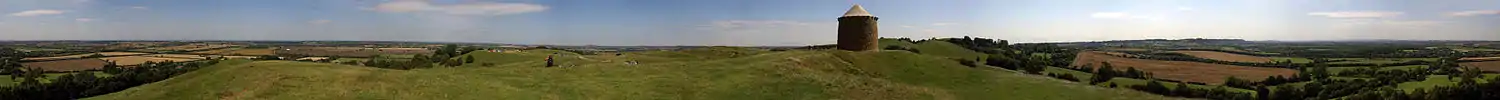 Impressive views across the surrounding countryside can be seen from the hills; towns and other features that are viewable are described by a toposcope. On a clear day, places as far afield as Coventry (more than 20 miles way) can be seen. The park and the church were used as a location in the Tom Selleck 1990 film Three Men and a Little Lady.