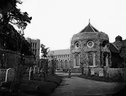 The abbey church of St Edmund was built in the 11th and 12th centuries on a cruciform plan, with its head (or apse) pointed east. The shrine of St Edmund stood behind the high altar. The abbey was much enlarged and rebuilt during the 12th century. At some 505 feet long, and spanning 246 ft across its westerly transept, Bury St Edmunds abbey church was one of the largest in the country. It is now ruined, with only some rubble cores remaining, but two other separate churches which were built within the abbey precinct survive, having always functioned as parish churches for the town. St James's Church, now St Edmundsbury Cathedral, was finished around 1135. St Mary's Church was first built around 1125, and then rebuilt in the Perpendicular style between 1425 and 1435.