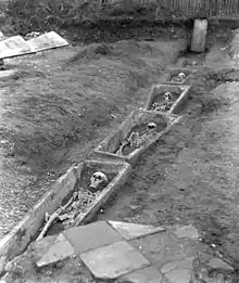 In the late 19th century, a manuscript discovered in France revealed the burial location of eighteen of the Abbey's abbots. The antiquary and author Montague R. James, an authority on the Abbey's history, oversaw an excavation of the chapter house, and on New Year's Day 1903 the coffins and remains of five of the abbots were shown to the public.[9]