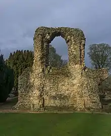 In 1345, a special commission found that the monks did not wear habits or live in the monastery.[4] Already faced with considerable financial strain, the abbey went further into decline during the first half of the 15th century. In 1431 the west tower of the abbey church collapsed. Two years later Henry VI moved into residence at the abbey for Christmas, and was still enjoying monastic hospitality four months later. More trouble arose in 1447 when the Duke of Gloucester died in suspicious circumstances after his arrest, and in 1465 the entire church was burnt out by an accidental fire. Largely rebuilt by 1506, the abbey of Bury St Edmunds settled into a quieter existence until dissolution in 1539. Subsequently stripped of all valuable building materials and artefacts, the abbey ruins were left as a convenient quarry for local builders. A collection of wolf skulls were discovered at the site in 1848.[5]