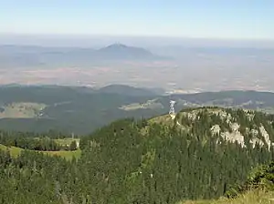 View of part of the Burzenland from the peak of Postăvaru. Ghimbav is on the right, while Codlea can be seen in the distance on Măgura Codlei.