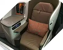 Business class is a travel class available on many commercial airlines and rail lines, known by brand names which vary, by airline or rail company. In the airline industry, it was originally intended as an intermediate level of service between economy class and first class, but many airlines now offer business class as the highest level of service, having eliminated first-class seating.[1] Business class is distinguished from other travel classes by the quality of seating, food, drinks, ground service and other amenities. In commercial aviation, full business class is usually denoted 'J' or 'C' with schedule flexibility, but can be many other letters depending on circumstances.[2][3][4]