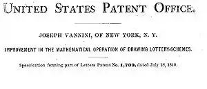 The first financial patent for which any detailed written description survives was to a printing method entitled "A Mode of Preventing Counterfeiting" granted to John Kneass on April 28, 1815.[6] The first fifty years of the U.S. Patent Office saw the granting of forty-one financial patents in the arts of bank notes (2 patents), bills of credit (1), bills of exchange (1), check blanks (4); detecting and preventing counterfeiting (10), coin counting (1), interest calculation tables (5), and lotteries (17).