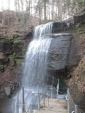 Buttermilk Falls Natural Area is located in Clyde, Indiana County, Pennsylvania, United States.[2] At 46 feet (14 m), they are one of the highest waterfalls in Pennsylvania. There is also a short trail to a location behind the falls.