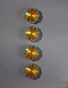 Buttons and button-like objects used as ornaments or seals rather than fasteners have been discovered in the Indus Valley Civilization during its Kot Diji phase (c. 2800–2600 BC),[1] a black Albertite button at the Tomb of the Eagles, Scotland (2200-1800 BC),[2][3][4] as well as Bronze Age sites in China (c. 2000–1500 BC) and Ancient Rome.