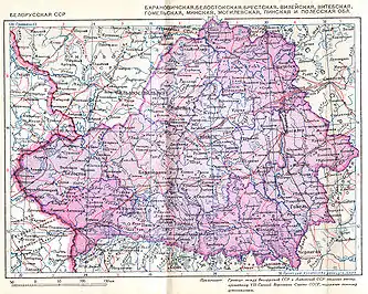 Byelorussia (also known as the Byelorussian Soviet Socialist Republic), known today as Belarus, was a republic of the Soviet Union when World War II began. The borders of Byelorussia were greatly expanded in the invasion of Poland of 1939 and finalised after World War II. Following the German military disasters at Stalingrad and Kursk, a collaborationist Byelorussian self-government (BCR) was formed by the Germans in order to drum up local support for their anti-Soviet operations. The Byelorussian BCR in turn formed the twenty-thousand strong Belarusian Home Defence (BKA), active from 23 February 1944 to 28 April 1945.[1] Assistance was offered by the local administrative governments from the Soviet era, and prewar public organizations including the former Soviet Belarusian Youth.[2] The country was soon overrun by the Red Army. Devastated by the war, Belarus lost significant populations and economic resources. Many battles occurred in Belarusian and neighbouring territory. Belarusians also participated in regional conflicts.