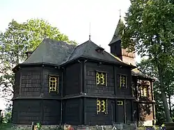 After the 1540s Reformation prevailed in the Duchy of Teschen and a local Catholic church was taken over by Lutherans. Local Protestants built there a wooden church in 1587. It was taken from them (as one from around fifty buildings) in the region by a special commission and given back to the Roman Catholic Church on 21 March 1654.[5] In spite of being bereft of place of worship many of the local inhabitants remained to be Lutherans. After issuing the Patent of Toleration in 1781 they subsequently organized a local Lutheran parish as one of over ten in the region.[6] The Catholic church was dismantled in 1897. In the place of this wooden church was later built a current Exaltation of the Cross Catholic wooden church. Lutherans built a wooden church in 1782 and current bricked one in 1811-1817.