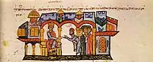 After negotiations between Theodore Sigritsa and the regency, a feast was organised in honour of Simeon I's two sons in the Palace of Blachernae presided over personally by Constantine VII. Patriarch Nicholas Mystikos went to the Bulgarian camp to meet the Bulgarian ruler in the midst of his entourage.[23][32] Simeon I prostrated himself before the Patriarch, who instead of an imperial crown placed upon Simeon I's head his own patriarchal crown.[23][27][29] The Byzantine chronicles, who were hostile to Simeon, had presented the ceremony as a sham, but modern historians, such as John Fine, Mark Whittow and George Ostrogorsky, argue that Simeon was too experienced to be fooled and that he was indeed crowned Emperor of the Bulgarians (in Bulgarian, Tsar).[33][34] The sources suggest that Nicholas Mystikos also agreed to Simeon's second condition, which could have paved Simeon's route to become co-emperor and eventually emperor of the Romans.[23][31][35] Having achieved his goal, Simeon I returned to Preslav in triumph, after he and his sons were honoured with many gifts.[27][29][36] To mark this achievement, Simeon changed his seals to read "Simeon, peacemaking emperor, [may you reign for] many years".[35]