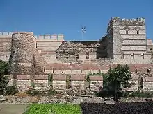 The first steps of the regency were to attempt to divert Simeon I's attack. Nicholas Mystikos sent a letter which, while praising the wisdom of Simeon, accused him of attacking an "orphan child" (i.e., Constantine VII) who had done nothing to insult him, but his efforts were in vain.[21][25] Toward the end of July 913 the Bulgarian monarch launched a campaign at the head of a large army, and in August he reached Constantinople unopposed. The head of the Byzantine chancery, Theodore Daphnopates, wrote about the campaign fifteen years later: "There was an earthquake, felt even by those who lived beyond the Pillars of Hercules."[26] The Bulgarians besieged the city and constructed ditches from the Golden Horn to the Golden Gate at the Marmara Sea.[27][28] Since Simeon I had studied at the University of Constantinople and was aware that the city was impregnable to a land attack without maritime support, those actions were a demonstration of power, not an attempt to assault the city. Soon, the siege was lifted and kavhan (first minister) Theodore Sigritsa was sent to offer peace.[29] Simeon I had two demands – to be crowned Emperor of the Bulgarians and to betroth his daughter to Constantine VII, thus becoming father-in-law and guardian of the infant emperor.[29][30][31]