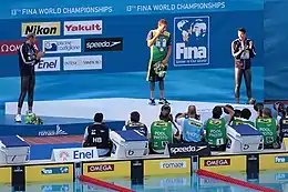 At the 2011 World Aquatics Championships in Shanghai, Cielo won the gold medal in the 50-metre butterfly with a time of 23.10 seconds.[94][95] Days later in the same competition, Cielo won a second gold medal in the 50-metre freestyle.[96][97] In the 100-metre freestyle, Cielo earned a time of 48.01 seconds, the best time of his life without the use of technological swimsuits, but ended in the fourth position, one-hundredth of a second away from winning a bronze and six hundredths away from silver.[98] The winner of the 100-metre freestyle was James Magnussen, an Australian who surprised the world a few days earlier with his time of 47.49 seconds in the 4×100-metre freestyle.[99]