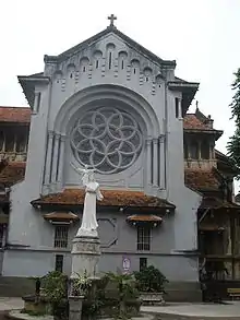 In the early 1920s, the French architect Ernest Hébrard began his urban plan to redesign the city of Hanoi, as a part of this plan, a new Roman Catholic church named Church of Martyrs was built in front of the Northern Gate (Cửa Bắc) of the ancient Hanoi Citadel in 1932.[1] Because of its location, the church was more commonly known as Cua Bac Church. Ernest Hébrard designed Cua Bac Church in eclectic style with strong influence of Art Deco decoration,[2] he also integrated in the Catholic Church some elements of the traditional architecture in Vietnam such as the system of roof tiles and the harmony between the main architecture with its surrounding green space. For that reason, Cua Bac Church is considered a fine example for the mixed style between European and Vietnamese architectures.
