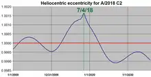 As of March 2018, A/2018 C2 is inbound 2.2 AU (330,000,000 km; 200,000,000 mi) from the Sun.[2] A/2018 C2 makes closest approach to the Sun on 2 June 2018 at a distance of 1.9 AU (outside the orbit of Mars).[3] Since this object out gassed generating a cometary coma while near the inner solar system, it was reclassified as a hyperbolic comet.[6]