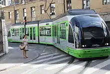 Vehicles in the Urbos AXL series have larger modules and railway-style pivoting axle bogies. With a maximum speed of 90 kilometres per hour (56 mph), it is designed for high-capacity, mass rapid transit systems.[7] This type of trams are currently in use only in two Northern European countries: