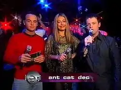 CD:UK was originally fronted by the same presenting team for SMTV Live - Ant & Dec and Cat Deeley. Ant & Dec left both programmes on 1 December 2001 and leaving Deeley as solo presenter. As time went on, due to her popularity with viewers, Deeley was offered more and more television work and went on to present Stars in Their Eyes and Fame Academy. This meant that she was absent from the show more and more and was frequently replaced by either a celebrity guest or Holly Willoughby from SMTV's successor Ministry of Mayhem. Deeley chose to leave the programme for good in March 2005. TRL presenter Dave Berry presented the programme for several weeks before Holly Willoughby became the new regular host presenting each fortnight with guest presenters such as Kelly Osbourne, Rachel Stevens, Brittany Murphy, Girls Aloud, Natalie Brown and Jayne Middlemiss filled in for the weeks when Willoughby was absent.