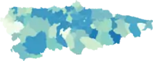 ![]() Confirmed COVID-19 cases per capita in Asturias by municipality as of 6 October: 0 cases per 100,000 people 1536 cases per 100,000 people (Ponga) | |