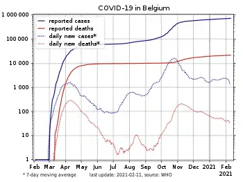 The COVID-19 pandemic in Belgium is part of the ongoing worldwide pandemic of coronavirus disease 2019 (COVID-19) caused by severe acute respiratory syndrome coronavirus 2 (SARS-CoV-2). The virus was confirmed to have spread to Belgium on 4 February 2020, when one of a group of nine Belgians repatriated from Wuhan to Brussels was reported to have tested positive for the coronavirus.[4][5] Transmission within Belgium was confirmed in early March; authorities linked this to holidaymakers returning from Northern Italy at the end of the half-term holidays.[6][7] The epidemic increased rapidly in March–April 2020. By the end of March all 10 provinces of the country had registered cases.