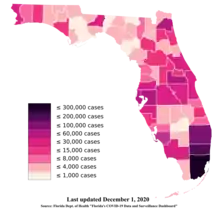 ![]() Total confirmed cases of COVID-19 in Florida by county as of the December 1, 2020 Florida Department of Health report. | |