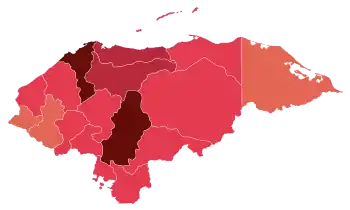 The COVID-19 pandemic in Honduras is part of the worldwide pandemic of coronavirus disease 2019 (COVID-19) caused by severe acute respiratory syndrome coronavirus 2 (SARS-CoV-2). The virus was first confirmed to have spread to Honduras on 10 March 2020, when two women tested positive for the virus after one of them landed on Toncontín International Airport in a flight from Madrid, Spain, and the other on Ramón Villeda Morales International Airport in a flight from Geneva, Switzerland.[2] Confirmed cases have been reported in all 18 departments of the country, with the majority of cases located in Cortés and Francisco Morazán.