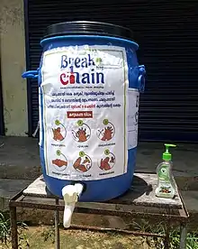 The Kerala government introduced a mass hand washing campaign named break the chain on March 15 to educate people about the importance of public and personal hygiene due to the spread of the novel coronavirus across the state. Health Minister of Kerala, Smt. K. K. Shailaja inaugurated the mass campaign. The government has appealed the public to promote break the chain campaign as a safety measure. During this campaign, the government has installed water taps with hand wash bottles at public spots of the railway stations and other public places.[37][38][39]