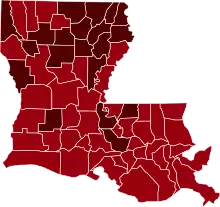 The first presumptive case relating to the COVID-19 pandemic in Louisiana was announced on March 9, 2020. Since the first confirmed case, the outbreak grew particularly fast relative to other states and countries. As of June 14, 2020, there have been 46,619 confirmed cases in Louisiana, and of those 2,901 people have died.[1] Confirmed cases have appeared in all 64 parishes, though the New Orleans metro area alone has seen the majority of positive tests and deaths.[1] Governor Edwards closed schools statewide on March 16, 2020, restricted most businesses to takeout and delivery only, postponed presidential primaries, and placed limitations on large gatherings.[2][3] On March 23, Edwards enacted a statewide stay-at-home order to encourage social distancing, and President Donald Trump issued a major disaster declaration, the fourth state to receive one.[2][4]