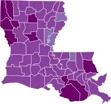 Early on March 19, Governor Edwards announced that the number of cases had risen to 347, with the majority of cases concentrated in Orleans and Jefferson Parishes. West Baton Rouge, Lafayette, Plaquemines, and St. James Parishes all were confirmed to have their first cases that morning. St. James Parish also announced that their first case would also be Louisiana's eighth death, the first outside of New Orleans and Jefferson Parish.[30] The New Orleans Saints' head coach Sean Payton announced that he had tested positive, becoming the first member of an NFL organization to do so.[31] The evening update from the Louisiana Department of Health increased the number of positive cases to 392 and the number of deaths to 10. New positive cases were found in Assumption, Calcasieu, Iberia, Iberville, Livingston, Rapides, St. Landry, and Webster Parishes, increasing the number of parishes with cases from 17 to 25. One case was reported in Acadia Parish was but later reclassified by the LDH. The two new deaths were announced to be from New Orleans, increasing the number of deaths in the city-parish alone to 8. Governor Edwards also announced at a press conference that the number of residents who died at the Lambeth House in New Orleans had increased to 5.[28]