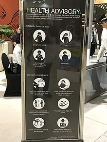On April 1, the City of Manila reports its largest single-day increase in coronavirus infections so far with 41 new cases, bringing the city's total to 116.[46] In the same day, more than 800 Filipino repatriates from four virus-stricken cruise ships in the U.S. arrive at the Ninoy Aquino International Airport.[47] The Inter-Agency Task Force on Emerging Infectious Diseases (IATF-EID) announced on April 2 that Metro Manila remains the worst hit by the coronavirus crisis in the country after 1,511 cases were confirmed in the region, or more than 50 percent of the total confirmed cases in the Philippines by that time.[48] COVID-19 inter-agency taskforce spokesman Karlo Nograles announces the mandatory wearing of face masks in public for residents in all regions under enhanced community quarantine in Luzon.[49] The Department of Health launches a 24/7 coronavirus hotline for Metro Manila residents.[50] On April 6, a ten-man medical team from China arrive in Manila to share their experience in prevention and control of the coronavirus disease,[51] while the Metro Manila Development Authority installed decontamination tents in all public hospitals and government offices across the region.[52] On April 3, the National Capital Region Police Office confirm its first COVID-19 casualty among its ranks.[53]