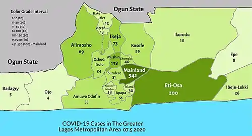 On 27 March, there were 16 new cases: eight in Lagos State, three in the FCT, two in Enugu State, two in Oyo State and one in Edo State.[35][36] On the same day, Lagos State governor, Babajide Sanwo-Olu announced that the local governments with the highest number of cases are Eti-Osa and Ikeja.[37]