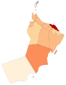 Muscat continues to be the most affected governorate with the highest number of confirmed cases at over 24,800 and 110 deaths,[1][5] and accounted for 76% of the total cases in the country by early June, with the majority of the cases being in the expatriate community.[6] On 10 April, the entire governorate was put under lockdown until 22 April,[7] this was extended twice,[8][9] with the lockdown being lifted on 29 May.[10]