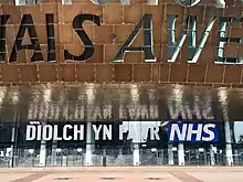On 27 March, it was announced that the Principality Stadium in Cardiff was to be used as a temporary hospital for up to 2,000 beds.[77] Each health board in Wales later announced that they are increasing the number of beds available in their current hospitals and, with the exception of Powys Teaching Health Board, would be opening a total of 16[78] temporary hospitals in available spaces.[79] In Powys, a further three special 'field hospital' facilities were set up- at the Brecon War Memorial Hospital, in Llandrindod Wells County War Memorial Hospital and at the Victoria Memorial Hospital, Welshpool- and beds were designated for the treatment of Covid-19 patients at community hospitals and health and care centres in Bronllys, Builth Wells, Knighton, Llanidloes, Machynlleth, Newtown and Ystradgynlais.[78] Powys also had arrangements with neighbouring boards for access to beds in case of need.[78]