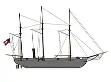 Early in the American Civil War the Confederate States Navy sought a way to break the blockade imposed by the United States Navy on Apalachicola Bay, which prevented most sea-borne commerce from reaching Apalachicola, Florida, Columbus, Georgia, and other points on the Apalachicola River and its tributary, the Chattahoochee River. The plan was to build seaworthy warships near the industrial center of Columbus, and sail them downriver to Apalachicola Bay to challenge the US Navy ships on blockade duty there.[2] In October 1861 the CS Navy contracted with David S. Johnston of Saffold, Georgia to build a gunboat. Originally expected to be completed in four months, the gunboat was finally delivered 10 months late, on December 8, 1862, still needing work. She was commissioned on February 24, 1863 as the CSS Chattahoochee. The Chattahoochee was a three-masted schooner with two steam engines, 130 feet (40 m) long, with a beam of 30 feet (9.1 m) and drawing 8 feet (2.4 m) of water at the stern. Using both engines and sails, it was capable of making a maximum of 12 knots (22 km/h; 14 mph).[3]