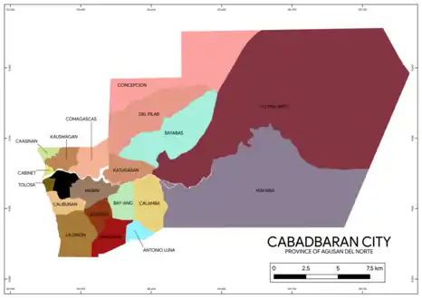 Cabadbaran is politically subdivided into 31 barangays.[6]