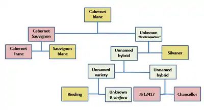 Cabernet blanc is a hybrid crossing of the Vitis vinifera wine grape Cabernet Sauvignon and an unknown disease-resistant variety that is known under the catch-all name in Germany as Resistenzpartner. Masters of Wine Jancis Robinson, Julia Harding and Swiss geneticist José Vouillamoz speculate that the identity of Resistenzpartner may be a complex hybrid that is a crossing of Silvaner with another grape that itself is a complex crossing with a Riesling x unknown Vitis vinifera and JS 12417 x Chancellor parentage.[1] This hypothesis is supported by fact, that Cabernet blanc contain resistance markers Rpv3 and Ren3.[6]