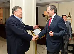 The Cabinet of Antonis Samaras succeeded the Caretaker Cabinet of Panagiotis Pikrammenos after the repeated legislative elections in May and June 2012. It was sworn in on Thursday, 21 June 2012.[1] The former ministries of Shipping, Tourism and Macedonia and Thrace were re-established.[2] The junior coalition partners, PASOK and DIMAR, chose to take a limited role in the cabinet, preferring to be represented by party officials and independent technocrats instead of MPs.[3] Vassilis Rapanos, the prime minister's first choice for finance minister, fell ill before being sworn in, and tendered his resignation on 25 June. Yannis Stournaras was then chosen as the new finance minister on 26 June, and sworn in on 5 July.[4][5]