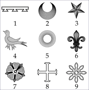 In heraldry, cadency is any systematic way to distinguish arms displayed by descendants of the holder of a coat of arms when those family members have not been granted arms in their own right. Cadency is necessary in heraldic systems in which a given design may be owned by only one person at any time, generally the head of the senior line of a particular family. As an armiger's arms may be used 'by courtesy', either by children or spouses, while they are still living, some form of differencing may be required so as not to confuse them with the original undifferenced or "plain coat" arms. Historically, arms were only heritable by males and therefore cadency marks had no relevance to daughters; in the modern era, Canadian and Irish heraldry include daughters in cadency. These differences are formed by adding to the arms small and inconspicuous marks called brisures, similar to charges but smaller. They are placed on the fess-point, or in-chief in the case of the label.[1] Brisures are generally exempt from the rule of tincture. One of the best examples of usage from the medieval period is shown on the seven Beauchamp cadets in the stained-glass windows of St Mary's Church, Warwick.[1]