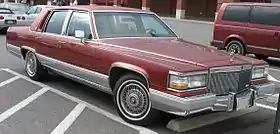 After a five-year absence, the Brougham name reappeared as an option package on the 1965 Cadillac Sixty Special.[3][4] The following year the Brougham moved up to becoming a subseries of the Fleetwood Sixty Special.[3][4] This continued through 1970.[3][4] Starting in 1971 the Sixty Special was only available as the well equipped Fleetwood Sixty Special Brougham.[3][4] When the Sixty Special Series was retired in 1977, the Cadillac Fleetwood Brougham took its place as Cadillac's largest owner-driven sedan model through 1986.[3][7] The single name "Brougham" began to be used as specific Cadillac model in 1987, when the term "Fleetwood" was dropped from the former Fleetwood Brougham. It was otherwise the same as the 1986 model. The reason for the change was that Cadillac had introduced a new, smaller, front-wheel drive model in 1985 and named it simply the Fleetwood. Compounding the confusion, the optional "d'Elegance" package (introduced in the upscale Fleetwood trim line in the 1970s, offering even more luxurious appointments, including button-tufted seating and rear-seat reading lamps), was available on and appended to the names of both models, resulting in a traditional body-on-frame/rear-wheel drive "Fleetwood Brougham d' Elegance" and a unibody/transverse engined "Fleetwood d' Elegance". The solution was dropping the term "Fleetwood" from the rear-wheel drive model, leaving just the "Brougham". Since it was body-on-frame, it was popular among coachbuilders who manufactured stretched limousines, along with the similar but somewhat smaller Lincoln Town Car, as well as traditional Cadillac buyers who preferred the familiar combination of exterior size, heft, and rear-wheel drive.[3][4] This was the last Cadillac to be produced without airbags.