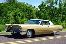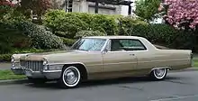 As it had been since DeVille became a separate series, DeVille denoted Cadillac's mainstream model, falling between the Calais (which had replaced the Series 62) and the Sixty Special and Eldorado. The DeVille was redesigned for 1965 but rode on the same 129.5-inch (3,290 mm) wheelbase. Tailfins were canted slightly downward, and sharp, distinct body lines replaced the rounded look. Also new were a straight rear bumper and vertical lamp clusters. The headlight pairs switched from horizontal to vertical, thus permitting a wider grille. Curved frameless side windows appeared, and convertibles acquired tempered glass backlights. New standard features included lamps for luggage, glove and rear passenger compartments and front and rear safety belts. Power was still supplied by the 340 horsepower 429 cu in (7,030 cc) V8, which would be replaced by the 472 cu in (7,730 cc) for 1968. Cadillac dropped the X-frame and used a new perimeter frame.[11] Pillared sedans appeared on the DeVille series for the first time, while six-window hardtop sedans were dropped. A padded vinyl roof was a $121 extra-cost option on the hardtop model. All four DeVille models had small "Tiffany-like" script nameplates on the ends of their rear fenders just above the chrome side molding.