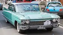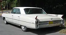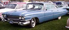 The 1959 Cadillac is remembered for its huge sharp tailfins with dual bullet tail lights, two distinctive rooflines and roof pillar configurations, new jewel-like grille patterns and matching deck lid beauty panels.[5] In 1959 the Series 62 were moved from the Series 62 to their own series, the Series 6200. DeVilles and 2-door Eldorados became the Series 6300 and Series 6400 respectively, though they all, including the 4-door Eldorado Brougham (which was moved from the Series 70 to Series 6900), shared the same 130 in (3,302 mm) wheelbase. Engine output was an even 325 hp (242 kW) from the 390 cu in (6.4 L) engine. The DeVille Series had script nameplates on the rear fenders. Standard equipment included power brakes with 15-inch wheels,[6] power steering, automatic transmission, back-up lamps, windshield wipers, two-speed wipers, wheel discs, outside rearview mirror, vanity mirror, oil filter, power windows and two-way power seats. Plain fender skirts covered the rear wheels and 4-doors were available in either four-window or six-window hardtop configurations. Over 53,000 DeVilles were sold in their first year as a separate series, accounting for roughly 37% of all Cadillacs sold.