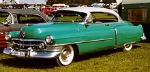 The Cadillac Series 62 Coupe de Ville was introduced late in the 1949 model year. Along with the Buick Roadmaster Riviera, and the Oldsmobile 98 Holiday, it was among the first pillarless hardtop coupes ever produced. At $3,496 it was only a dollar less than the Series 62 convertible, and like the convertible, it came with power windows standard. It was luxuriously trimmed, with leather upholstery and chrome 'bows' in the headliner to simulate the ribs of a convertible top. In its first year the Series 62 Coupe de Ville only sold 2,150 units. But 1950 sales more than doubled to 4507, and in 1951 sales more than doubled again to 10,241 exceeding the sales for the Series 62 Club Coupe that year. Also, in 1951, Coupe de Ville chrome script appeared on the rear roof pillar for the first time, to further distinguish it from the Series 62 Club Coupe.[3][4]