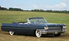 Cadillac was restyled again for 1963. Exterior changes imparted a bolder and longer look. Hoods and deck lids were redesigned. The front fenders projected 4.625 inches further forward than in 1962 while the tailfins were trimmed down somewhat to provide a lower profile. Body-side sculpturing was entirely eliminated. The slightly V-shaped radiator grille was taller and now incorporated outer extensions that swept below the flush-fender dual headlamps. Smaller circular front parking lamps were mounted in those extensions. A DeVille signature script was incorporated above the lower beltline molding near the rear of the body. A total of 143 options including bucket seats with wool, leather, or nylon upholstery fabrics and wood veneer facings on dash, doors, and seatbacks, set an all-time record for interior appointment choices. Standard equipment was the same as the previous year. The engine displacement and output remained the same, 390 cu in (6.4 l) and 325 hp (242 kW).[9]