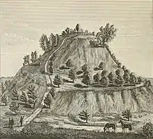 ![]() Monks Mound, the largest earthen structure at Cahokia (for scale, an adult is standing on top) | |