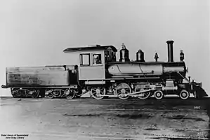 The first section, in length 13 miles 75 chains 19 links was opened for public traffic on 3 May 1897. At that time the entire rolling stock available for use comprised one 11 inch cylinder locomotive, built at the Baldwin Locomotive Works in Philadelphia, U.S.A., in 1879(purchased from the Railway Department, Cairns, for the sum of £700), and five second-hand ballast waggons, purchased at Gladstone from the railway contractors Messrs. James Overend & Co for the sum of £125. Subsequently, ten F waggons, five H waggons, and two timber waggons were built for the board by the Toowoomba Foundry Company. A tramcar with seating accommodation for sixty passengers, which had been previously in use on the Government lines, was purchased from the Railway Department, in Brisbane, for £100. With the assistance of a guard's van and a convertible car, the latter was exclusively for indigenous passengers — hired from the Railway Department, together with other passenger and goods stock hired from the department as occasion demanded, the board was enabled to cope with the rapidly increasing traffic in the first year in a fairly satisfactory manner. The total cost of the board's rolling-stock in use to 30 June 1898, was £2879 8s. 8d., equal to £206 11s. per mile open.[3]