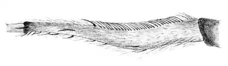 In spiders, the calamistrum is a row of specialized leg bristles used to comb out fine bands of silk.[1] It is only found on cribellate spiders, that is, spiders that possess the spinning organ known as the cribellum.[2] The calamistrum and cribellum are used to form the hackled bands of silk which are characteristic of the webs of these spiders.[2] The calamistrum is found on the upper margin of the metatarsus of the hind legs.[2] Each bristle of the calamistrum is serrated on one side and smooth on the other.[1]