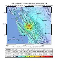 A magnitude 5.6 earthquake occurred on the Calaveras Fault on October 30, 2007 at 20:04 PDT (October 31, at 03:04 UTC), near Alum Rock. Prior to the 2014 South Napa earthquake, it was the most powerful quake to hit the Bay Area since the Loma Prieta earthquake of 1989, and the largest on the Calaveras Fault since 1984.
