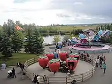 In 2005, park management expressed interest in additional roller coasters.[32] "Twiz & Twirl: The World's First Interactive Dual-Zone Maze" and thrill ride Chaos were added in 2005, with chair swing Swing Around taken out for next year's The Storm.[33] The park's 25th anniversary, the next year, added The Storm: Mother Nature's Thrill Ride, children's swing ride Swirly Twirl, and U-Drive: Safety School of Motoring, a renovated Turnpike. The park entrance was renovated.[34] Drop tower Free Fallin' replaced Topsy Turvy, swing ride The Dream Machine, ferris wheel Balloon Ascension, and Flying Ace were added in 2007.[35] The Park became a kilometre closer to Calgary in 2007 after the city expanded its borders. Family ride Tip Top was retired at the end of the season. Samba Spin was added in 2008.[36]
